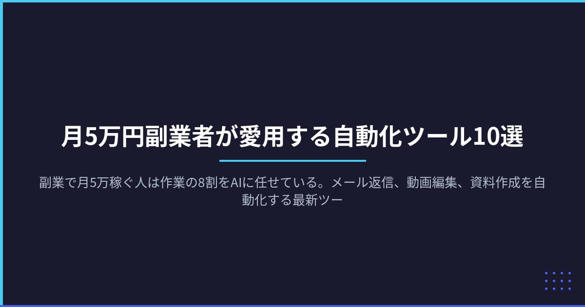 副業で月5万稼ぐ人は作業の8割をAIに任せている。メール返信、動画編集、資料作成を自動化する最新ツール10個を厳選。無料で始められるものから紹介。今日から使える具体的な活用法つき。