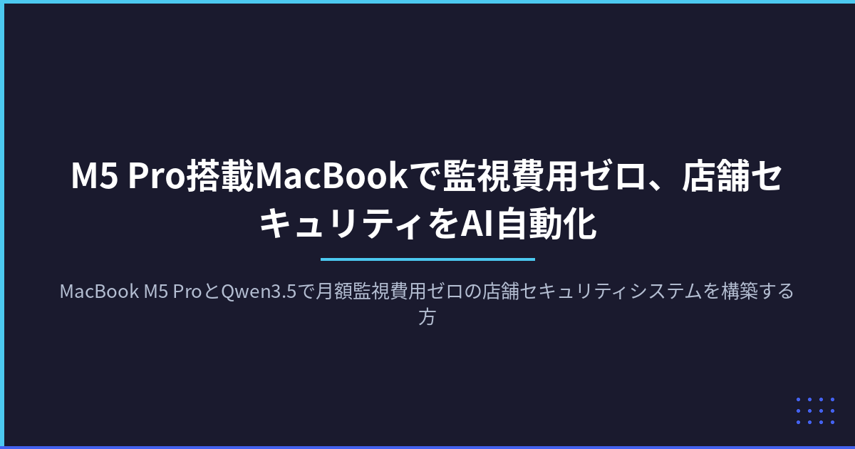 MacBook M5 ProとQwen3.5で月額監視費用ゼロの店舗セキュリティシステムを構築する方法を解説。クラウド型監視カメラの月額費用を削減し、ローカルAIで不審者検知から通知まで自動化できます。初期費用のみで運用可能な実践手順を公開。