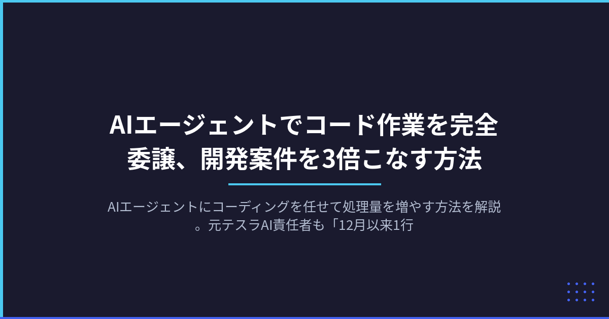 AIエージェントにコーディングを任せて処理量を増やす方法を解説。元テスラAI責任者も「12月以来1行も書いていない」と語る最新動向から、ツール選び、委譲すべき作業、注意点まで実践的にまとめました。