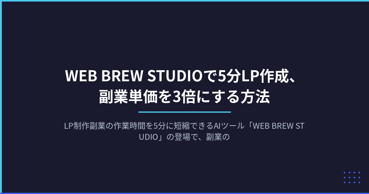 LP制作副業の作業時間を5分に短縮できるAIツール「WEB BREW STUDIO」の登場で、副業の収益構造が変わります。工数1/10で単価を上げる新しい稼ぎ方を具体的に解説します。